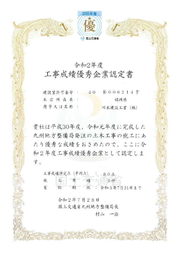 2020年07月20日 働き方改革促進優秀施工業者 局長表彰 九州地方整備局
